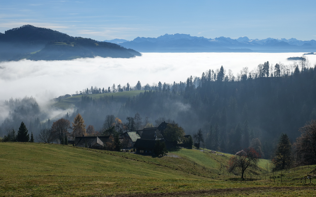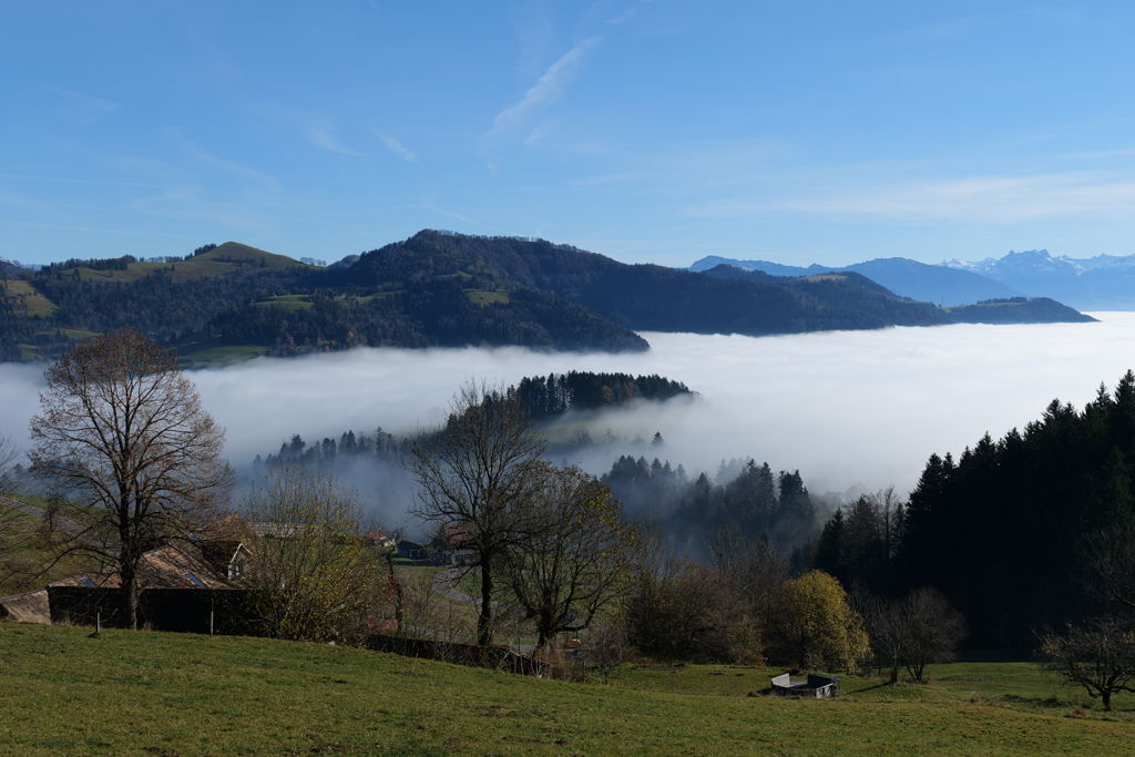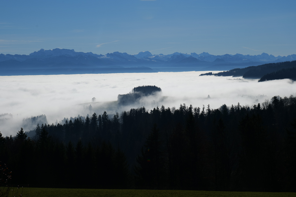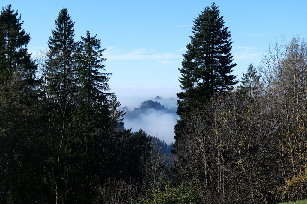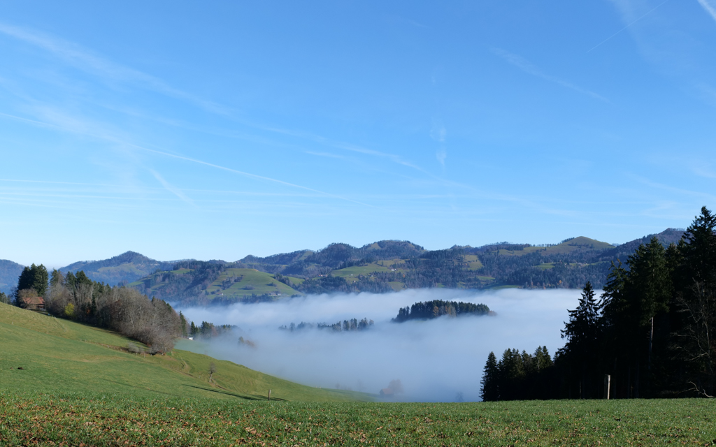 Yesterday was no exception. I hiked from Steg (CH) to Bäretswil (CH), via the Täuferhöhle. All day, there was a thick fog, up around 500 m, but higher up there was sunshine. When I looked down the valley, I had the idea of looking into a lake. Hills above the top of the clouds made the impression of being islands in this lake.