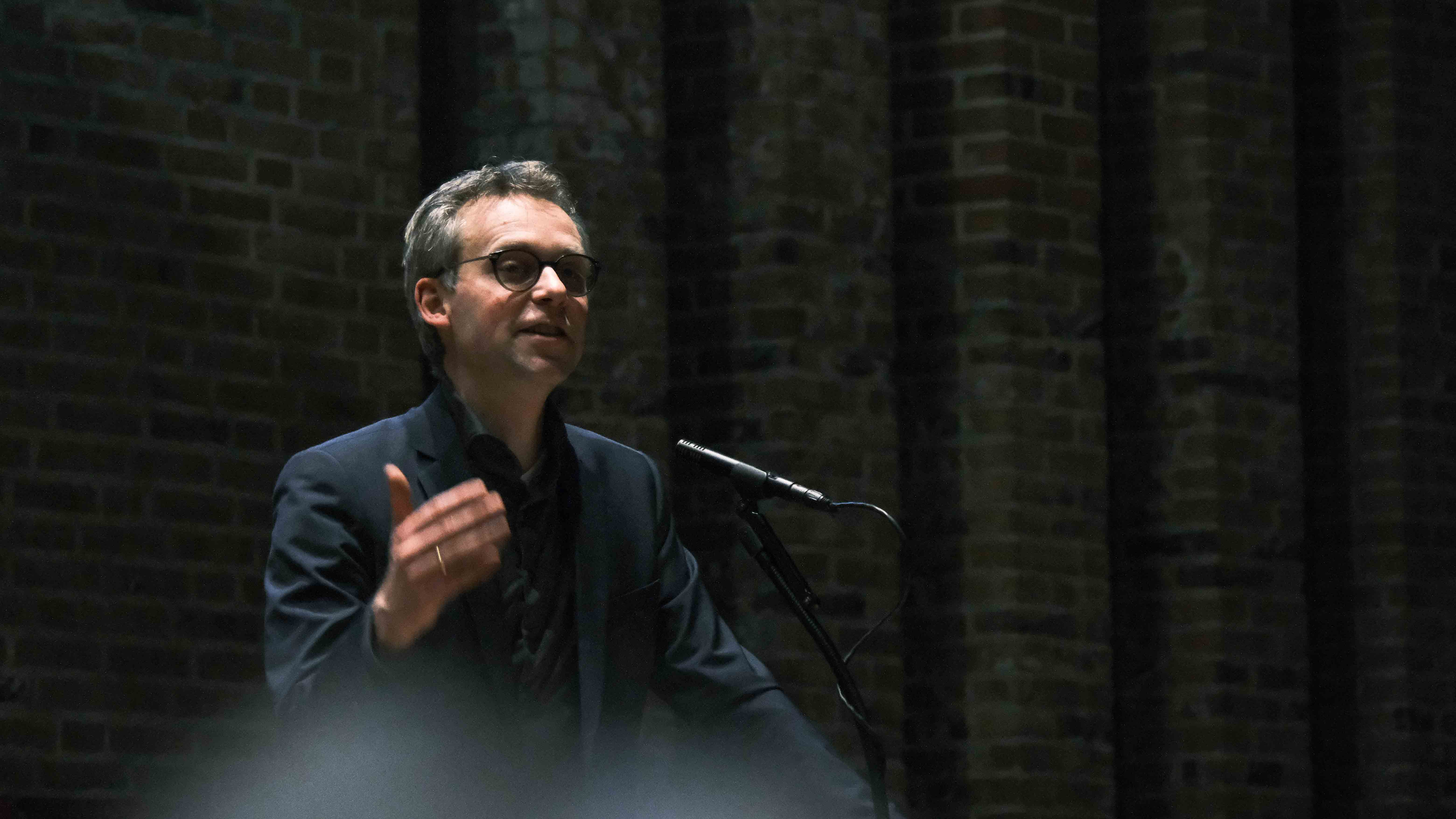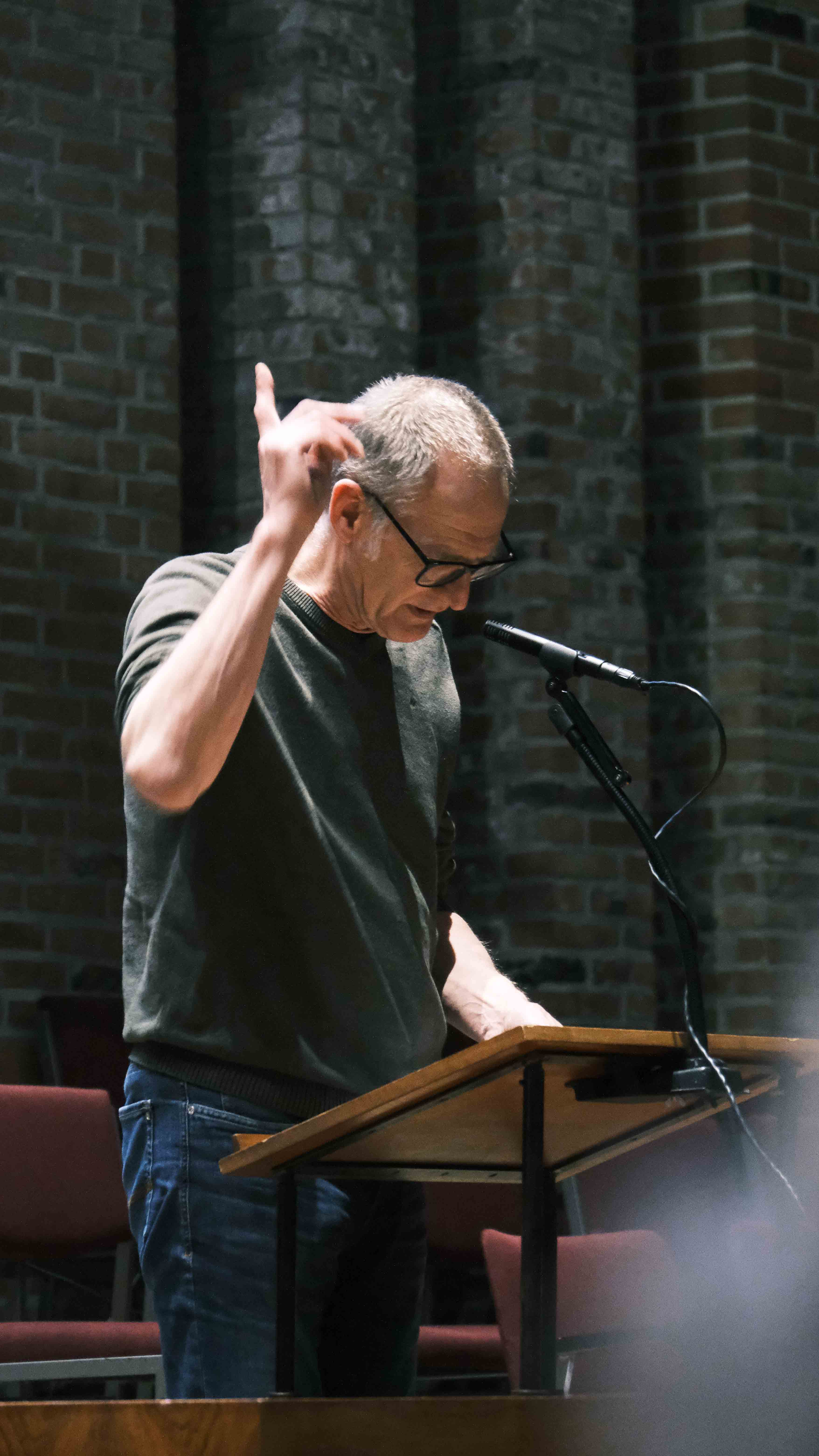 The music was a performance of the ‘Seven last words of Christ’ by Joseph Haydn, played by the Ars Musica Ensemble, conducted by Patrick van der Linden. The pictures and sermon by Dutch photographer Corbino (Maarten Corbijn).